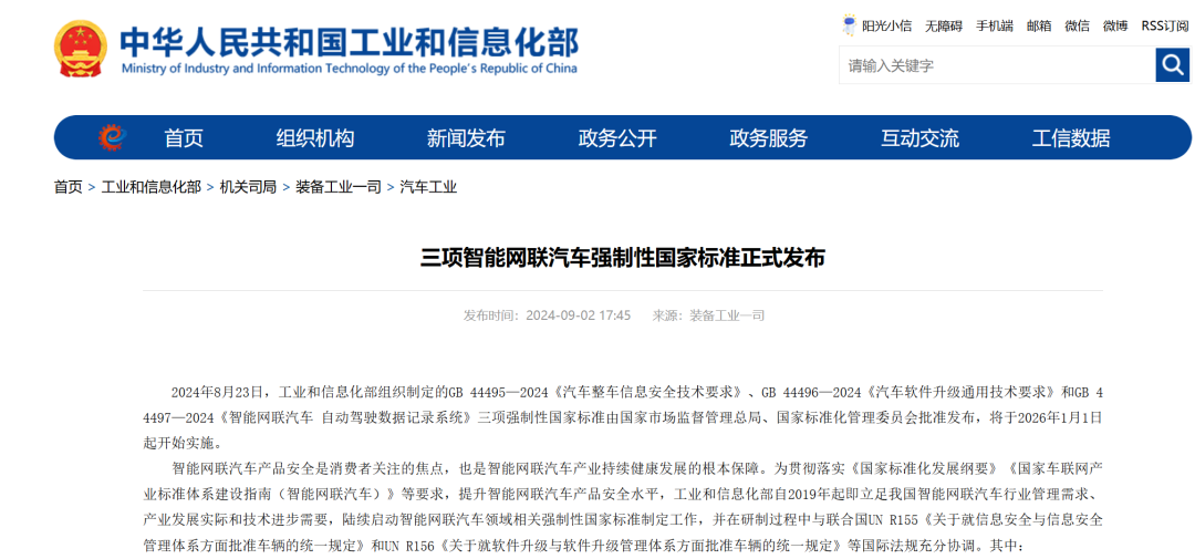 GB 44495-2024《汽车整车信息安全技术要求》规定了汽车信息安全管理体系要求,以及外部连接安全、通信安全、软件升级安全、数据安全等方面的技术要求和试验方法,适用于M类、N类及至少装有1个电子控制单元的O类车辆,对于提升我国汽车产品的信息安全防护技术水平、强化产业链风险防范和应对网络攻击的能力、筑牢汽车信息安全防护基线具有重要意义。