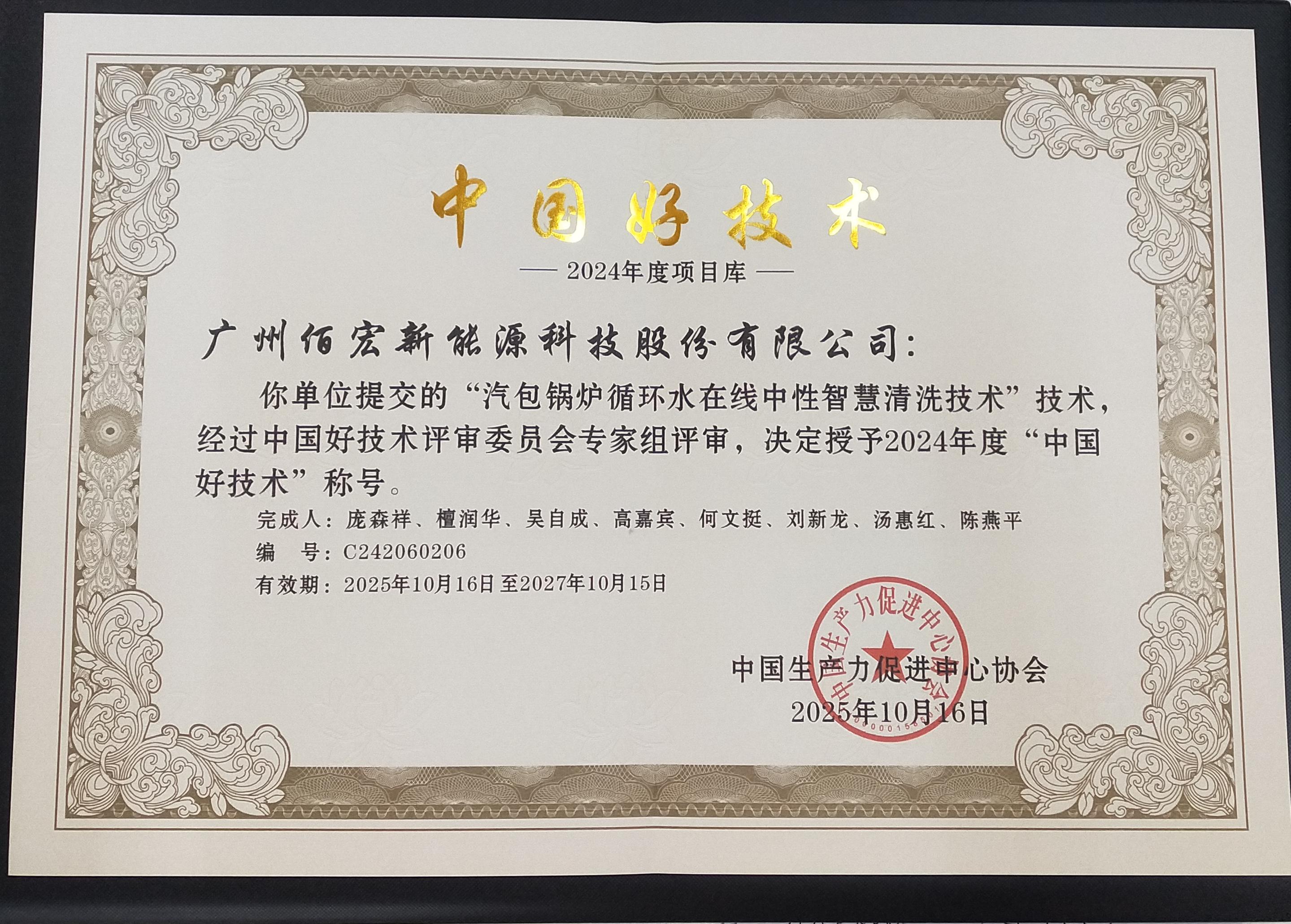 近日,由中国生产力促进中心协会联合全国各级科技服务机构共同发起的2024年“中国好技术”评选结果正式揭晓,全国只有270个项目脱颖而出获评殊荣。其中,广州佰宏新能源科技股份有限公司(以下简称“佰宏新能源”)自主研发的“汽包锅炉循环水在线中性智慧清洗技术”凭借突出的创新性、实用性与环保价值成功入选,公司销售总监李霞受邀出席颁奖大会并代企业领奖。
