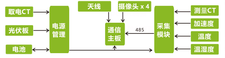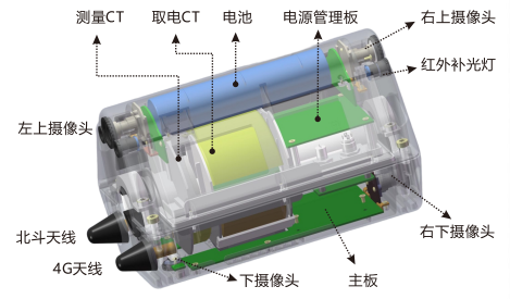 4个摄像头、测量CT以及加速度、温度、湿度传感器组成的采集模块,实时捕捉线路覆冰画面与各项重要数据。