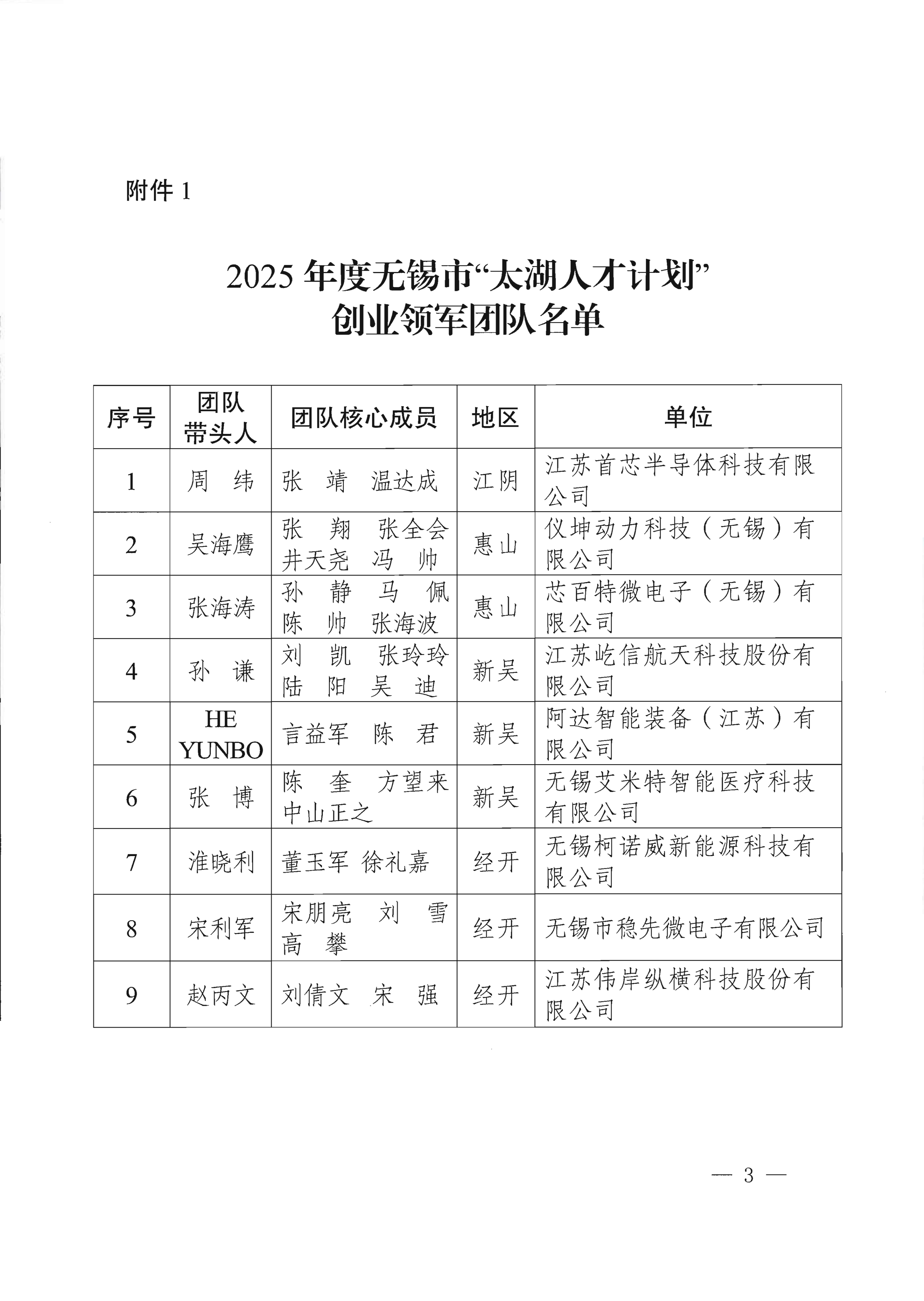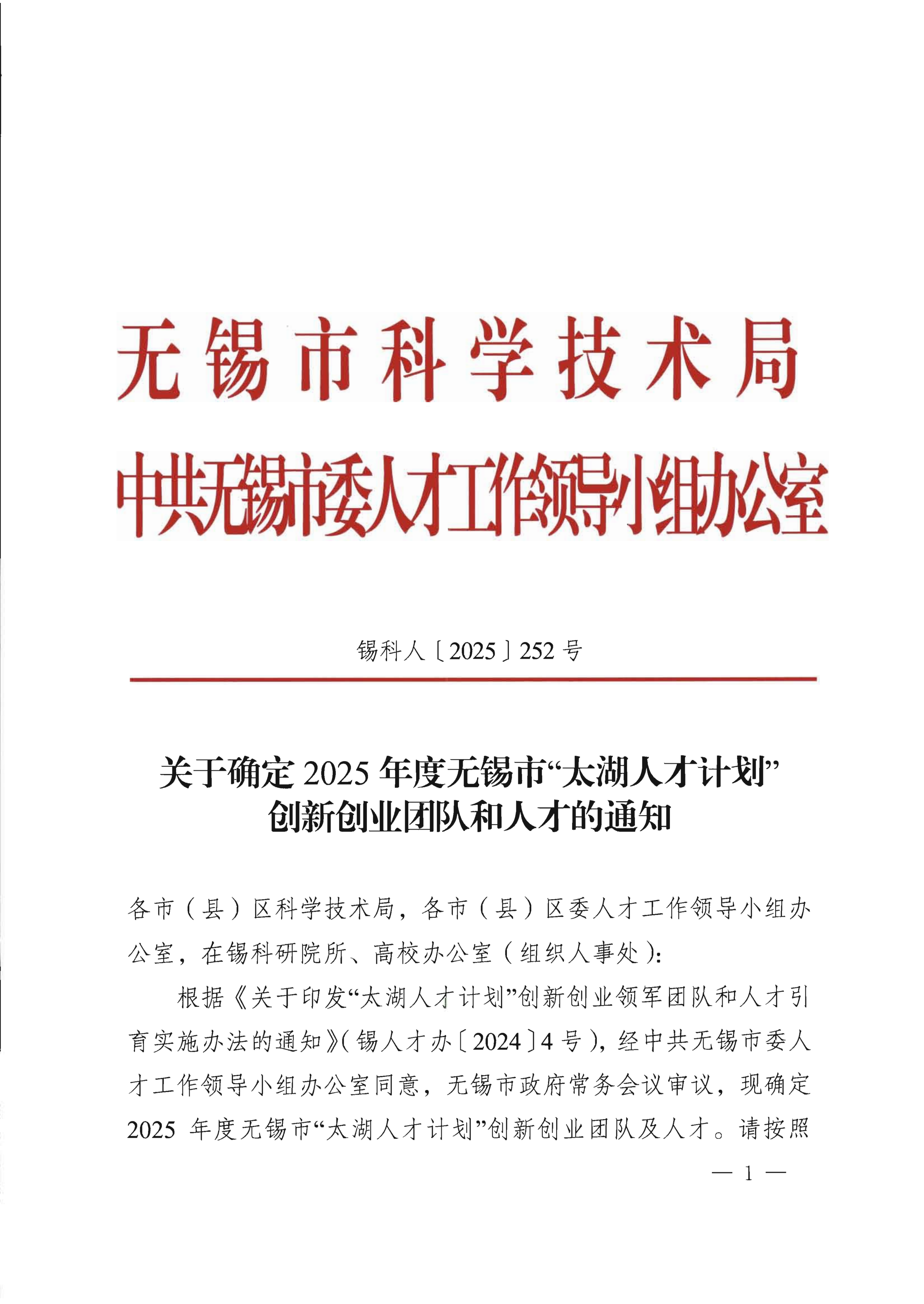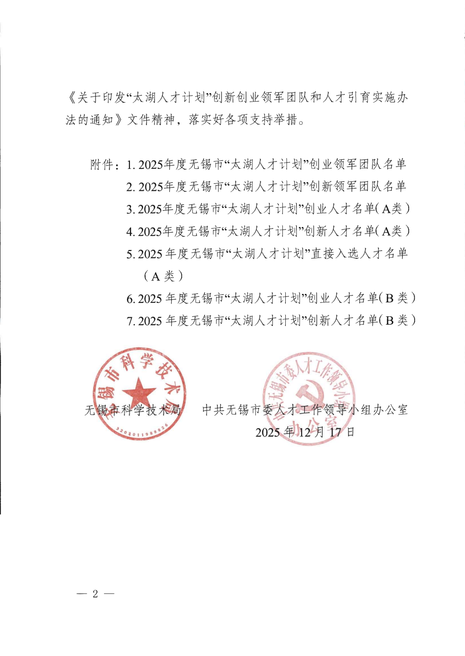 据悉,“太湖人才计划”是无锡市为打造国内一流具有国际竞争力人才发展高地所制定的人才引进政策,在集聚领军人才、推动产才融合等方面成效显著,为城市发展注入强劲动能。本次“太湖人才计划”由无锡市人才工作领导小组办公室、无锡市科技局、无锡市工业和信息化局、无锡市财政局、无锡市人力资源社会保障局、无锡市卫生健康委等部门组织实施,经多轮严苛遴选,遴选出创业领军人才团队、创新领军人才团队、创业人才、创新人才等多个专项。