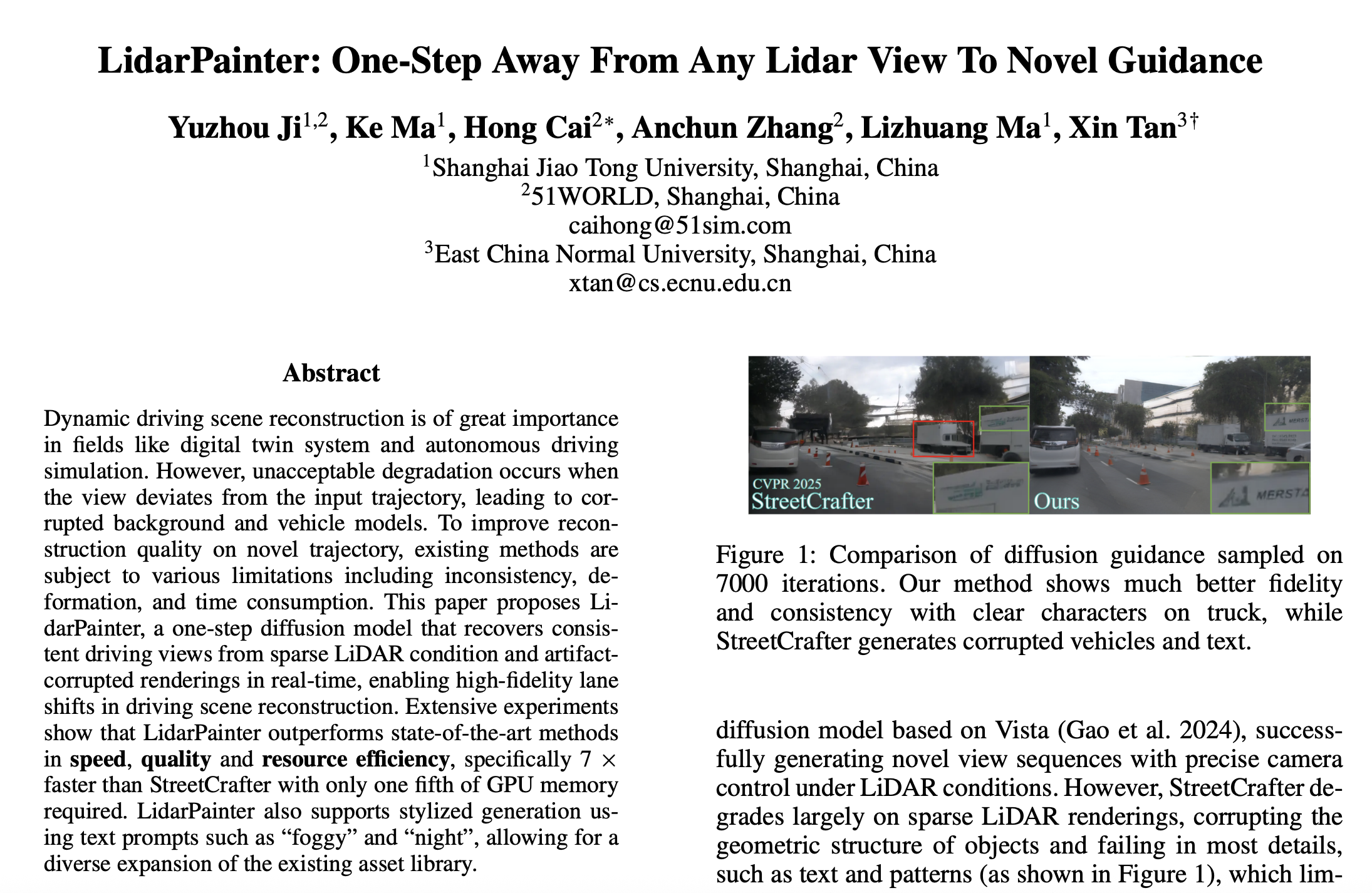 在技术架构层面,51Sim的端到端解决方案涵盖多个关键组件。SimOne智能驾驶仿真平台提供高保真场景重建与泛化能力,通过融合3DGS技术与图形引擎,实现动力学仿真、激光雷达仿真及摄像头仿真置信度分别达到95%、95%、90%。4DGS闭环仿真体系支持通过一段视频clip重建可用于神经渲染的4D场景,结合生成模型对车辆、轨迹、视角等要素进行修改,指数级提升数据价值。LidarPainter单步扩散新视角合成模型相比业界方法处理速度提升7倍,显存占用降至五分之一。