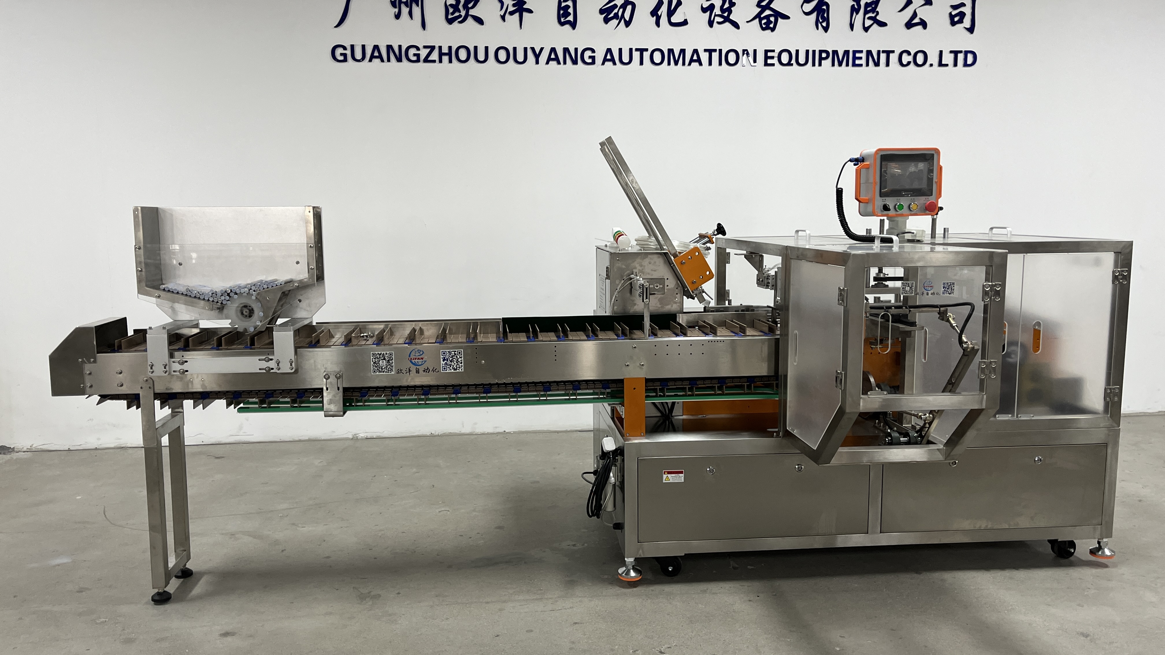 广州欧洋自动化设备有限公司基于17年的行业经验积累,开发出专门针对医药行业的全自动装盒机系列产品。该系列设备采用卧式链条式单向传动结构,具备以下技术特征: