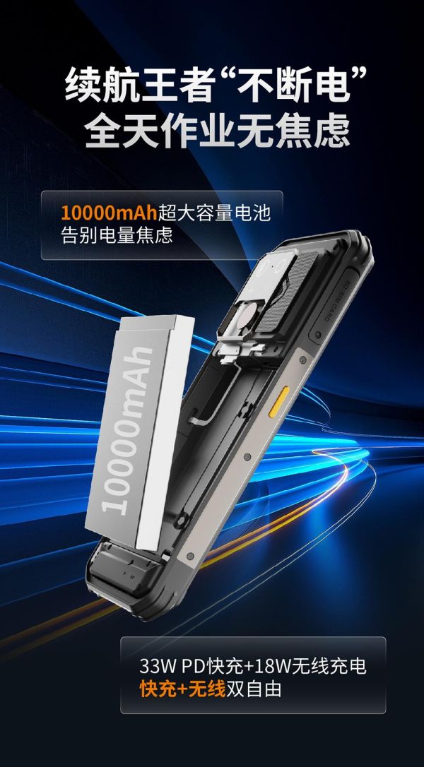 6.72英寸FHD+屏幕(分辨率1080×2400)采用熊猫玻璃覆盖,表面硬度≥7H,在户外强光或雨水环境下仍能保持良好的可视性与抗划擦能力。6400万主摄+200万微距的后置相机组合,以及5000万像素前置摄像头,满足了现场证据留存、远程技术指导等多样化需求。