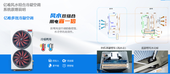 多效冷凝技术:通过湿帘喷淋预冷、再冷盘管二次换热及冷凝水回收三级串联机制,将冷凝器进风温度降低8-12℃,使冷凝温度从常规55℃降至45℃,蒸发温度提升至15℃。该技术响应高温工况下的散热瓶颈问题,物理机制为:湿帘蒸发吸热创造低温进风环境→再冷盘管利用冷却水二次冷却高压冷媒→提高过冷度增加单位制冷量。相比传统风冷系统,在35℃以上环境下可维持额定制冷能力,COP能效比实测达5.13(基于实际工况测试数据)。