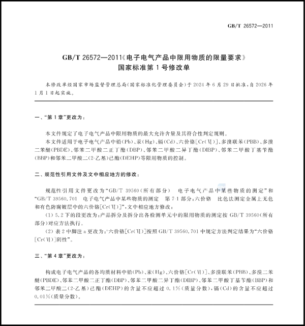 2026年1月1日起,根据国家市场监督管理总局2024年第14号国家标准公告,中国RoHS配套标准《电子电气产品中限用物质的限量要求》GB/T 26572-2011《第1号修改单》正式实施,且检测方法同步更新为GB/T 39560系列标准。